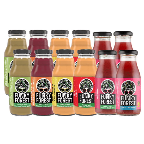 A csomag összesen 8 darab 330 ml (2 alma-körte-uborka-spenót, 2 alma-cékla-répa, 2 alma-gyömbér, 2 100% alma,) és 4 db 200 ml (2 100% ribizli, 2 alma-eper-tőzegáfonya) terméket tartalmaz.