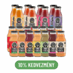 A csomag összesen 14 darab 330 ml (2 100% alma, 2 alma-őszibarack, 2 alma-cékla-répa, 2 alma-gyömbér, 2 alma-körte-uborka-spenót, 2 alma-meggy-bodza, 2 alma-mangó-chili) és 8 darab 200 ml (2 alma-mangó-sütőtök, 2 alma-ribizli-,mangó, 2 100% ribizli, 2 alma-körte-feketeribizli) terméket tartalmaz.