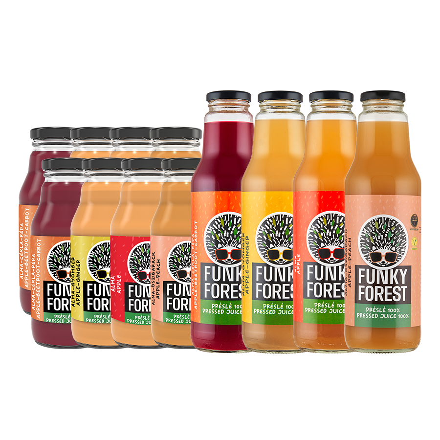 A csomag 8 darab 330 ml (2 alma-cékla-répa, 2 alma-gyömbér, 2 100% alma, 2 alma-őszibarack ) és 4 db 750 ml (alma-cékla-répa, alma-gyömbér, 100% alma, alma-őszibarack) terméket tartalmaz. A csomagban 1 db 330 ml préslevet ajándékba adunk.