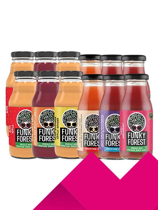 A csomag összesen 6 darab 330 ml (2 100% alma, 2 alma-cékla-répa, 2 alma-gyömbér) és 6 db 200 ml (2 100% ribizli, 2 alma-körte-feketeribizli, 2 alma-mangó-ribizli) terméket tartalmaz.
