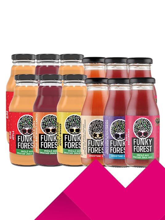 A csomag összesen 6 darab 330 ml (2 100% alma, 2 alma-cékla-répa, 2 alma-gyömbér) és 6 db 200 ml (2 100% ribizli, 2 alma-körte-feketeribizli, 2 alma-mangó-ribizli) terméket tartalmaz.